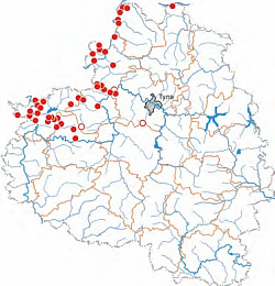 В регионе до начала XXI в. отмечался как локальный вид с более высокой численностью именно в Тульской обл. на правобережье р. Оки [2]. С 2010-х годов на фоне смягче- ния климата увеличивается в численности, расширяет гигропреферендум и расселяется к центральной части области вдоль массива Полошевской засеки и лесов в долине р. Крушмы [1]. В то же время, не обнаружены признаки расселения вида к югу от приокских участков засек, в центральной части Окско-Упинского водораз- дела и на большей части (кроме самой западной окраины) Орловской засеки. К настояшему времени стало известно не менее 41 местообитания (не менее 33 из которых в пределах 9 – 10 системообразующих массивов) площадью от немногих десятков до сотен га, но в некоторых нарушенных биотопах могут быть не вполне устойчивые очаги. Ещё в 2 местах, в Алексинском (на правобережье Упы, 2022 г.) и Дубенском (на восточном краю засечного массива, 2022 г.) р-нах, отмечались единичные особи; в Щёкинском р-не (п. Ясная Поляна, 2021 г.) был залёт или занос. В правобережных местообитаниях в разные годы наблюдается от нескольких до нескольких сотен бабочек, когда их плотность в ценопопуляциях может превышать 100 экз./га. В послед- ние годы правобережная метапопуляция вида продолжает увеличиваться в численности и расселяться, но в довольно узкой полосе, и уже есть признаки укоренения ценопопуляций в некоторых лучше прогреваемых биотопах. Окончательные выводы о результатах этого расселения преждевременны.