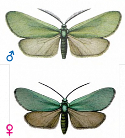 Размах крыльев 20 – 28 мм [1]. Вершина усиков без булавовидного утолще- ния. Усики самца с суживающимися к концу гребёнками, самки – без них. Передние крылья и переднеспинка однотонной и почти одинаковой изумрудно-зелёной окраски. Сходные виды: J. globulariae (Hbn.) (внешне не отличим; см. очерк), J. chloros (Hbn.) (см. очерк) и Adscita statices (L.) (самец отличим по усикам с очень близ- кого расстояния, самка – под увеличением).
