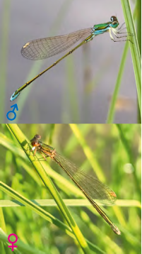 Самая мелкая стрекоза европейской фауны с очень тонким телом. Длина тела 23 – 28 мм, размах крыльев 22 – 33 мм [9, 10]. Основная окраска верхней части тела зелёная с бронзовым блеском, нижней – у самца голубая, у самки жёлтая. На передних краях крыльев тёмное пятно (птеростигма) короткая, сероватая. От сходных видов рода Lestes и, отчасти, самок из других родов равнокрылых стрекоз данный вид отличим в первую очередь наименьшими размерами.