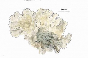 Таллом листоватый, в центре плотно прикрепленный к субстрату, по краям иногда приподнимающийся, округлый или неопределенной формы, 5-15 см в диаметре. Лопасти 2-8(15) мм шириной, сомкнутые или частично налегающие, с округлыми концами. Верхняя поверхность жел- товато-зеленоватая до бледно-жёлтой (в затенённых условиях серовато-зеленоватая), гладкая до морщинистой, с зернистыми, одноцветными с верхней поверхностью соредиями, изначально в окру- глых, кратеровидных соралиях, затем соралии становятся извилистыми и сливаются между собой. Нижняя поверхность чёрная (по краям тёмно-коричневая), с чёрными, простыми ризинами, по краям переходящими в бородавочки. Апотеции образуются очень редко, сидячие, с коричневым диском [1]. Споры одноклеточные, по 8 в сумке, 16—24 x 8—13 мкм. Реакции: верхняя кора — KOH (–); сердцевина и сорали — Ca(ClO)2 (–), KOH+Ca(ClO)2 (+/–) красный.