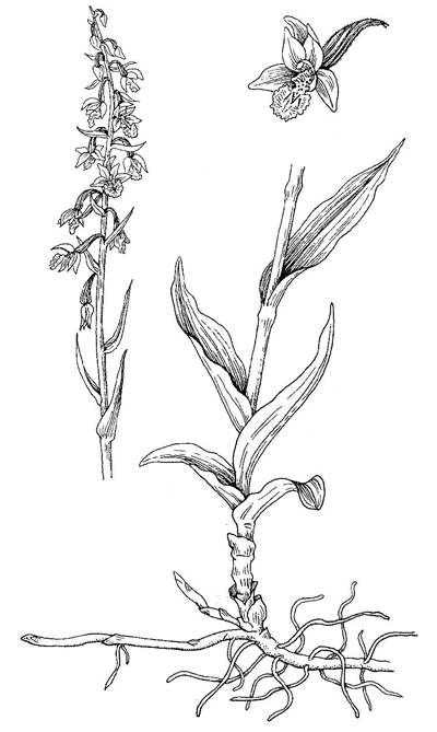 Многолетнее травянистое растение высотой от 30 до 80 см, с длинным ползучим разветвленным корневищем. Листья длиной до 25 см, очередные, продолговатые, голые; верхние — более мелкие. Соцветие — кисть из 6—20 расставленных поникающих цветков до 25 мм длиной. Цветки кремово-белые с грязновато-фиолетовыми полосками. Губа без шпорца, с волнистым краем, разделена на две доли глубокой поперечной вырезкой.