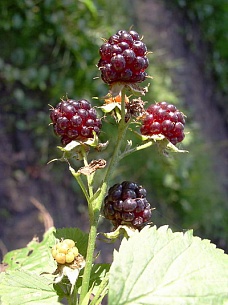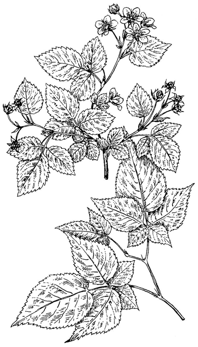 Кустарник высотой около 1 м. Плодущие побеги дуговидно согнутые, молодые — почти прямостоячие, ребристые, зеленые, покрытые короткими шипами. Листья тройчато-сложные или пальчато-перистые; конечный листочек более крупный, с длинным черешочком с шипами; остальные листочки заметно мельче, с короткими черешочками или сидячие. Цветки относительно крупные, белые, собраны по несколько в пазушные щитковидные кисти. Плоды сравнительно небольшие (до 1 см в диаметре), сочные, малиново-черные, похожие на плоды малины, но при этом не отделяющиеся от плоского цветоложа.