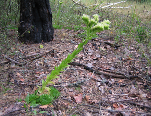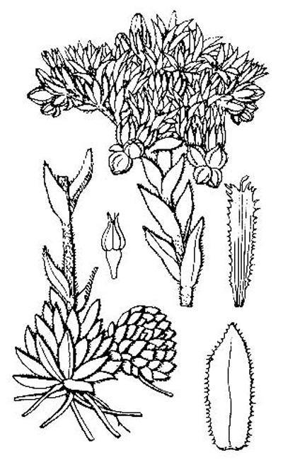 Многолетнее растение, образующее шаровидные укороченные побеги в виде прикорневой розетки сочных мясистых листьев. Корневая система слабая. Цветоносный побег высотой 10-30 см, с более мелкими сидячими листьями. Многочисленные цветки собраны в густое щитковидное соцветие. Венчик с 6 бледно-желтыми или зеленоватыми лепестками. Околоцветник железисто-опушенный.