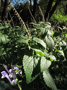 Травянистый многолетник высотой 50–150 см с прямыми четырехгранными, коротко железистоопушенными стеблями, супротивными листьями и побегами. Листья сердцевиднояйцевидные, длинночерешковые, городчатые; верхушечные — сидячие, цельнокрайние. Соцветие — однобокая негустая длинная кисть, резко отграниченная от остальной части растения. Цветки двугубые. Венчик сверху фиолетовый, снизу желтовато-белый; чашечка фиолетовая, с характерным полым выростом.