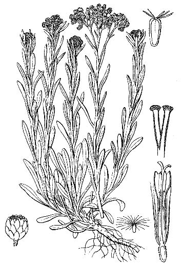 Многолетнее стержнекорневое войлочно шерстисто-опушенное травянистое растение. Вегетативные побеги представлены прикорневыми розетками; цветоносные побеги прямостоячие или восходящие, простые, высотой 10—40 см. Листья очередные, простые, цельнокрайние; нижние — обратнояйцевидно-продолговатые или лопатчатые, суженные в черешок, средние и верхние — мелкие, линейные, сидячие. Корзинки почти шаровидные, 4—6 мм в диаметре, собраны по 8—30 в компактный щиток. Листочки оберток пленчатые, лимонно-желтые или оранжевые. Все цветки в корзинке трубчатые, венчик желтый или светло-бурый. Плоды — продолговатые коричневые семянки с хохолком из мягких кремовых волосков.