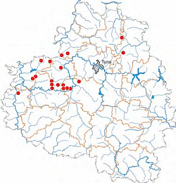 В сопредельных областях вид известен только в Орловском По- лесье, но данные о численности неизвестны [3]. В Тульской обл. к 2012 г. было известно 19 ключевых место- обитаний площадью по несколько десятков га. Большой численности и плотности вид достигает в наименее нарушенных старых широколиственных лесах: в полосе южных Тульских засек от д. Орлово до Северо-Одо- евского лесничества плотность ценопопуляций достигает нескольких экз./кв. м, на остальных участках засек и за их пределами – единичные находки. В последнее десятилетие наблюдения за изменениями численности не проводились, но неблагоприятные изменения биогеоценозов не отмечены.