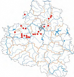 В сопредельных областях вид не обнаружен. В Тульской обл. к 2012 г. было известно 23 местообитания площадью от десятков до сотен гектаров. При этом ценопопуля- ция в окрестностях д. Сахаровка (Алексинский р-н) была успешно интродуцирована в 2007 г. [1]. Во многих местообитаниях достигает довольно высокой численности, до нескольких десятков экз./кв. м. В последнее десятилетие наблюдения за изменениями численности не проводились, но неблагоприятные изменения биоге- оценозов практически не отмечены.